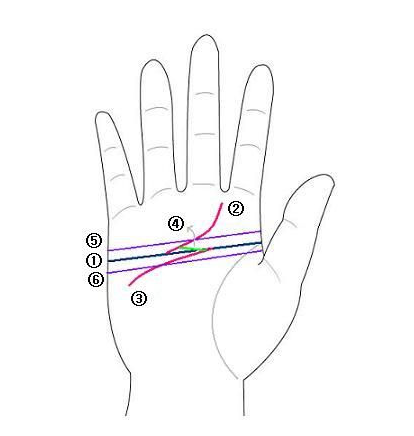 막쥔손금이 그림 ⑤번과 같이 윗쪽으로 붙어 있으면 감정선에 두뇌선이 붙은 격으로 봐서 더욱 감정적인 경향이 두드러지게 나타나고, ⑥번과 같이 아래로 쳐져 있으면 두뇌선에 감정선이 붙은 격으로 봐서 냉정하고 이성적이 품성이 더욱 강하게 드러나게 됩니다.